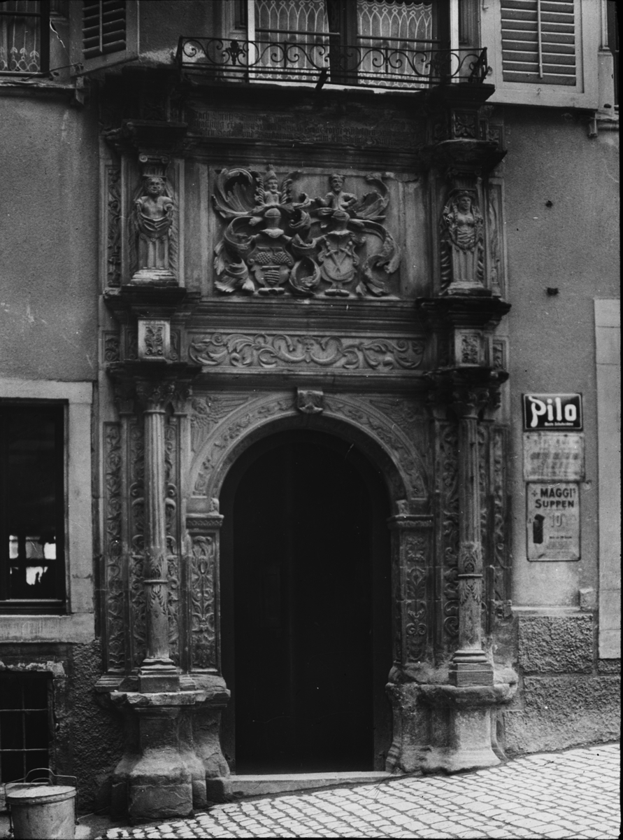 Skioptikonbild med motiv av port till okänt hus i Schwäbische Hall.