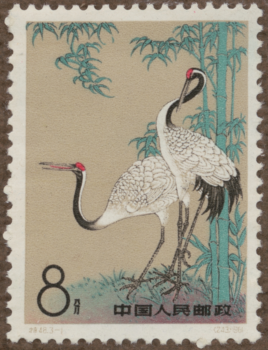 Titel: Frimärke ur Gösta Bodmans filatelistiska motivsamling, påbörjad 1950. Frimärke från Kina, 1961. Motiv av rödkronad-/manchurisk-/ japansk trana.