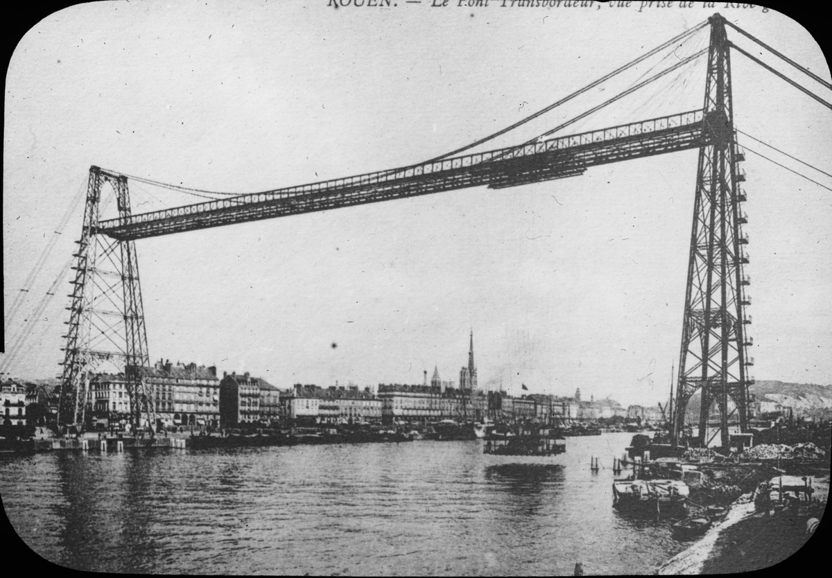 Skioptikonbild med motiv av bron Le Pont Transbordeur i Rouen. Bron byggdes 1899 och stod fram till 1940 då den bombades av franska trupper tyska armén.