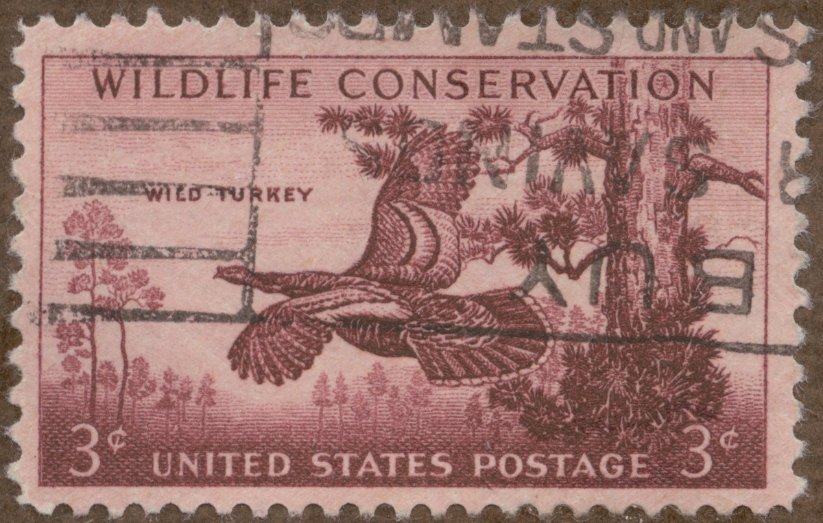 Frimärke från U.S.A., 1958. Motiv av Flygande vild Kalkon "De vilda djurens bevarande"