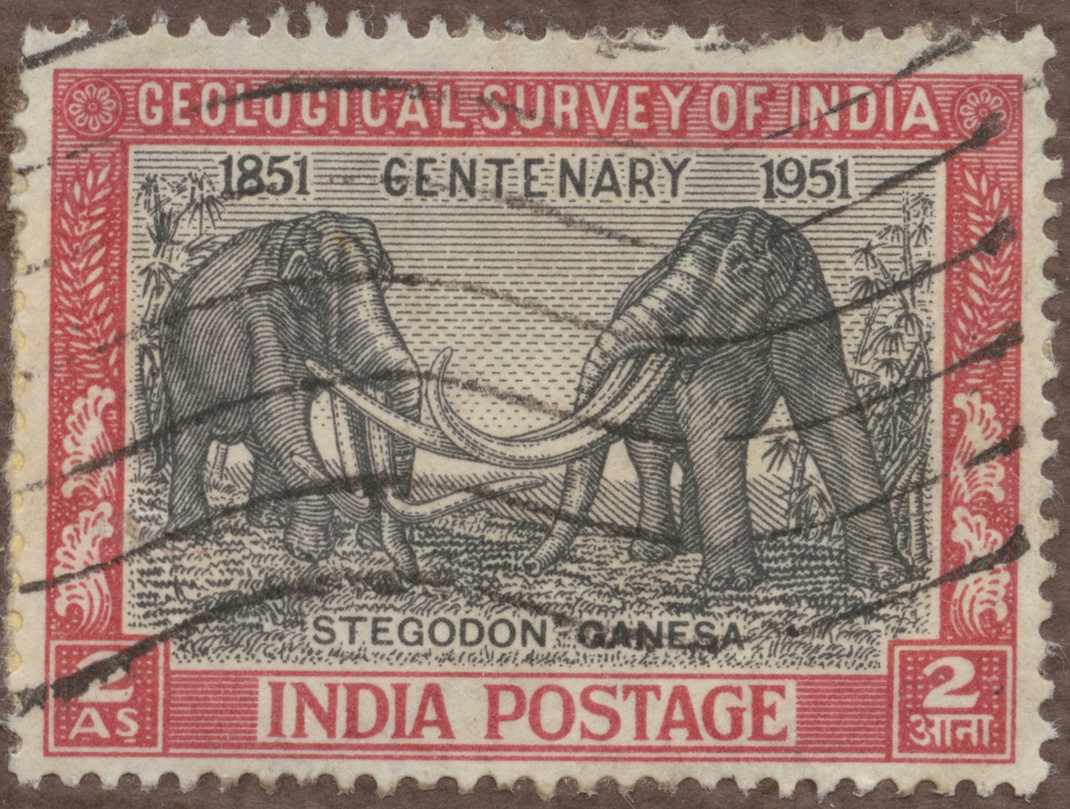 Frimärke från Indien, 1951. Motiv av Mammut indisk Elefant: -Utdöd genus: "Stegodon Ganesa"- Indiens geologiska undersökning: 100 år: 1851-1951