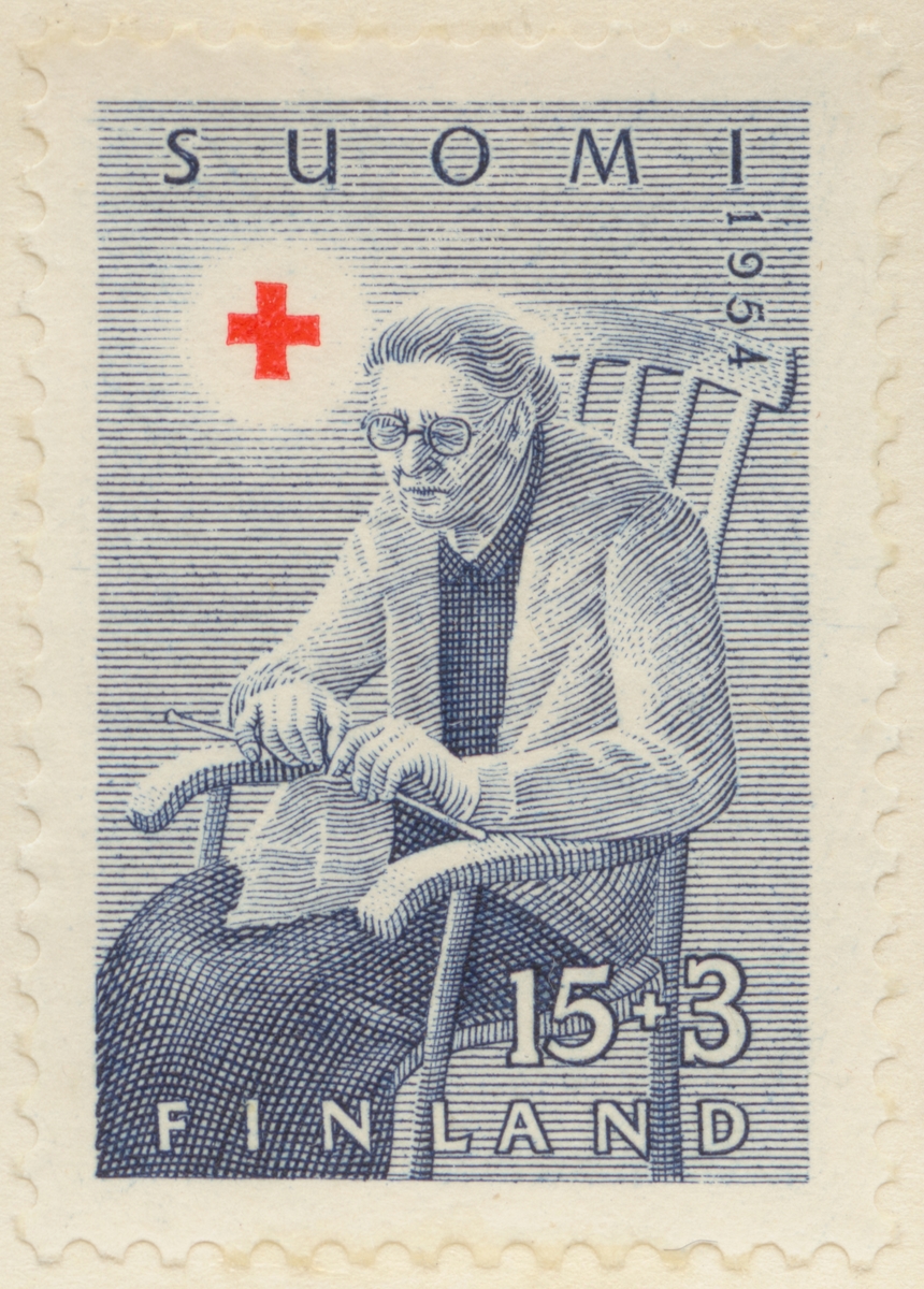Frimärke från Finland, 1954. Motiv av åldring med stickning. "Till förmån för Röda Korset".