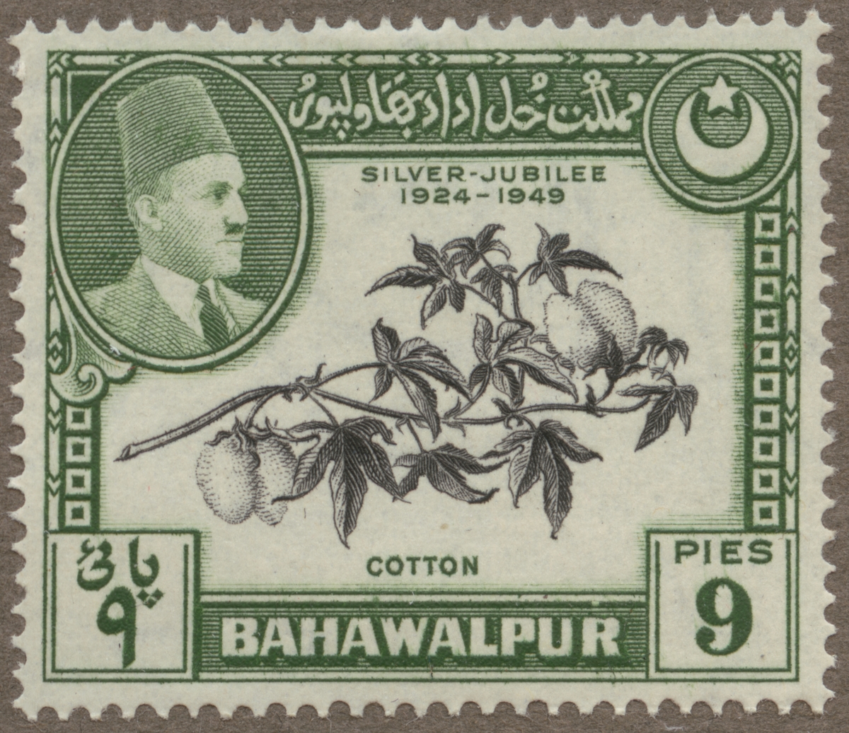 Frimärke från Bahawalpur (Pakistan), 1949. Motiv av bomullsgren med mogen skörd i Punjab, Paktistan. T.v. Amir Khan V.