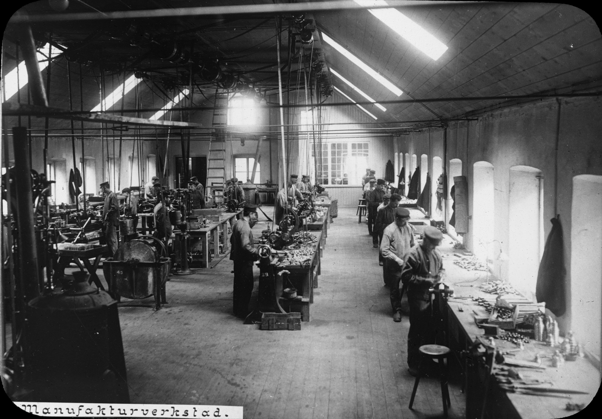 Skioptikonbild med motiv från yrkesinspektionens undersökningar på olika arbetsplatser. Manufakturverkstad.