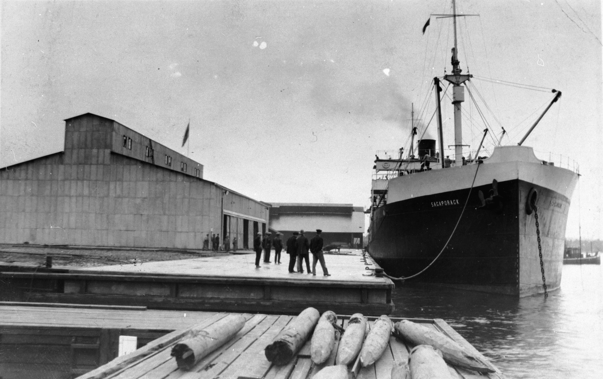 Byggherre: Byggnadsaktiebolaget Contractor, Stockholm. Den färdiga massamagasinskajen vid sulfitfabriken.