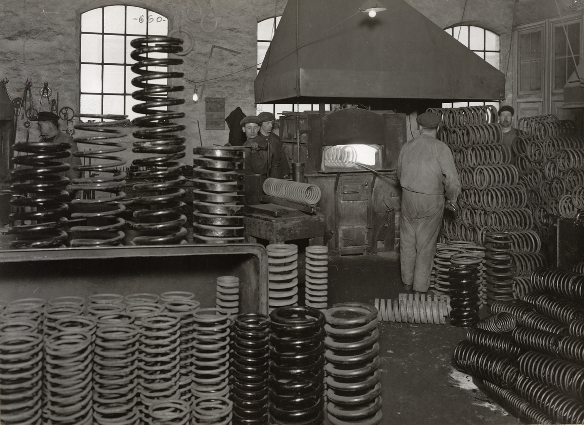AB Svenska Spiralfabriken. Härdning av spiralfjädrar. Interiör.