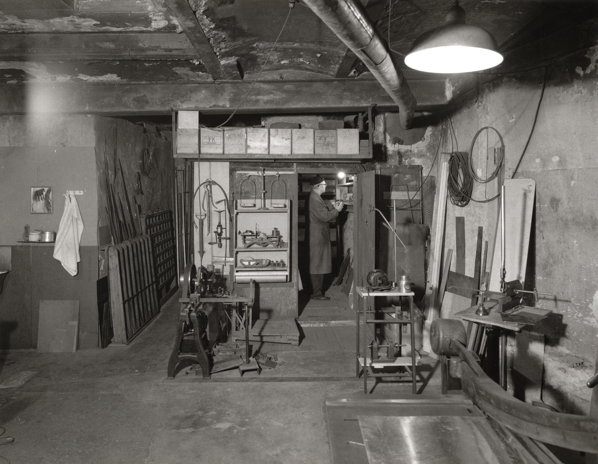Albin Sjöströms Mekaniska Verkstad. Verkstadens ena rum sett från entre'n. Fabrikör Sjöström i verkstadens förråd. Till vänster kallsågen.