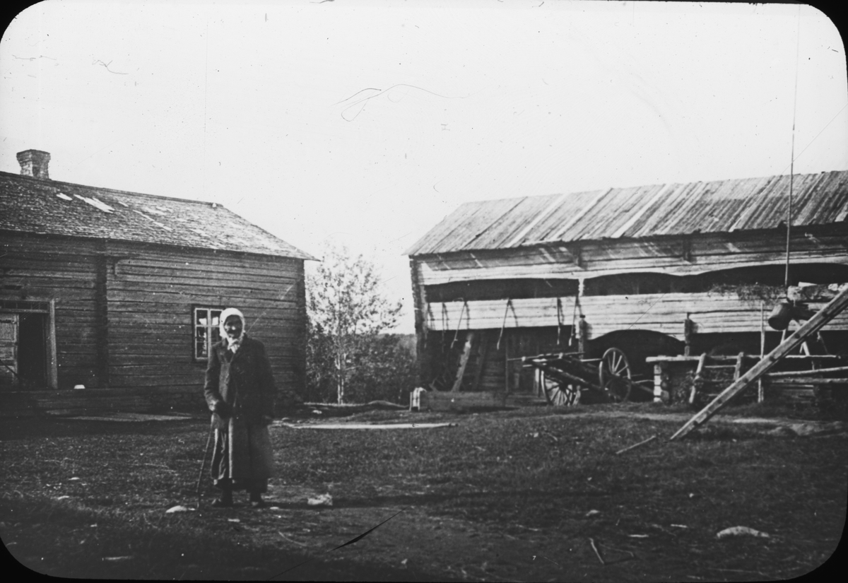 Skioptikonbild. Äldre kvinna på okänd gård.