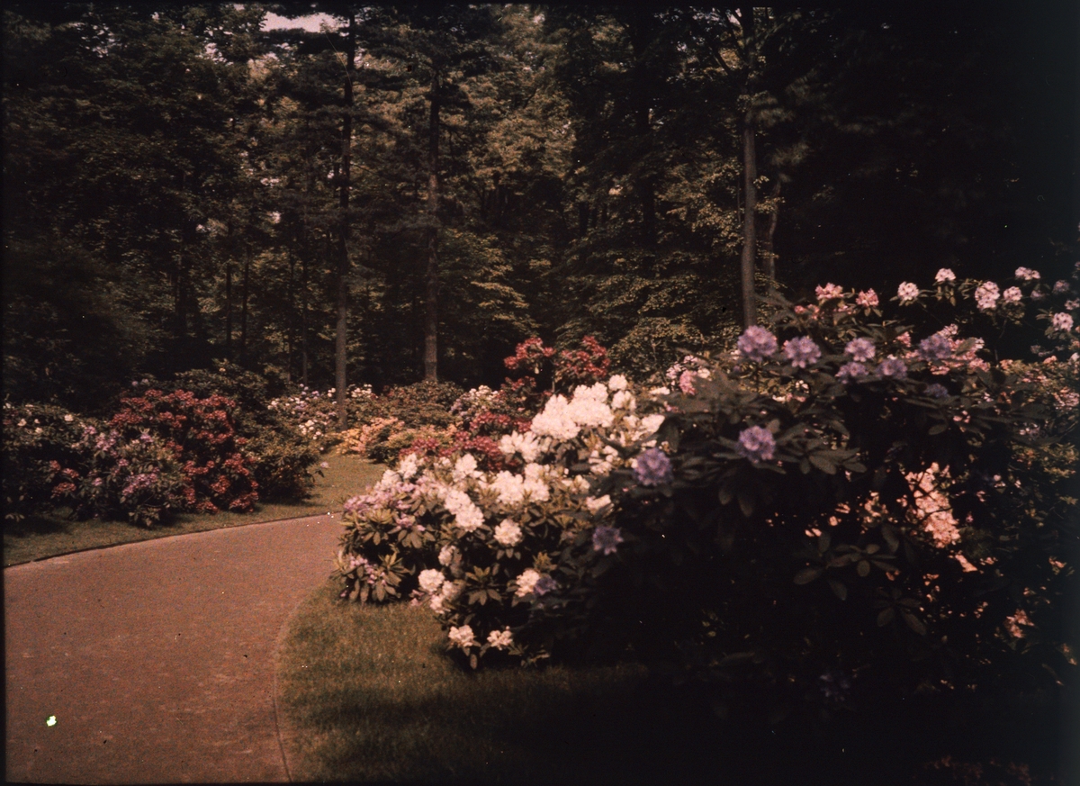 Lumières-autokrom. Stor trädgårdsodling av rododendron i Dresden. Fotograferad i maj 1910 med f/48, 95 sek. exponering.