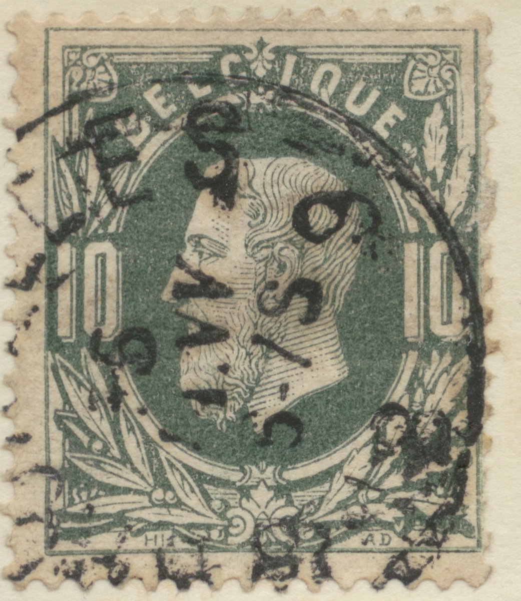Frimärke från Belgien, 1869. Motiv av lagerkvistar. "Kung Léopold II".