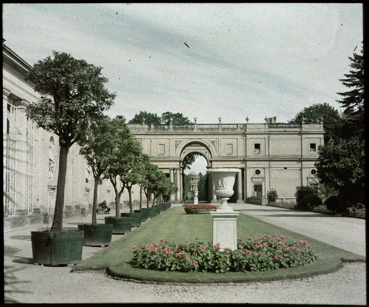 Agfa-autokrom. Byggnad med park framför. Möjligen Berlin.