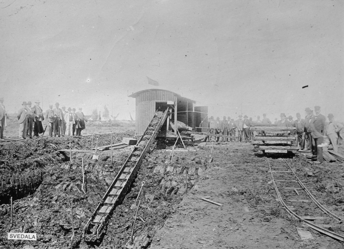 Skioptikonbild med motiv av bränntorvmaskin, Anrep-Svedala. Perssons torfutsättningsbana.