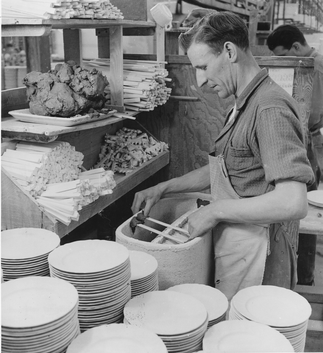 Rörstrands Porslinsfabrik, Lidköping. Fyllning av glaserade flintporslintallrikar i kapsel för glasyrbränning i nya fabriken.