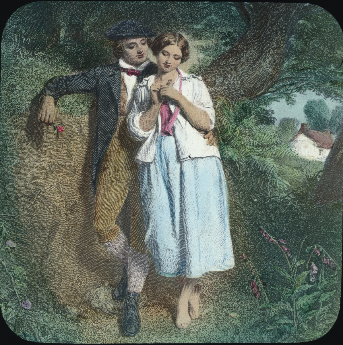 Kolorerad skioptikonbild med motiv av ungt kärlekspar.