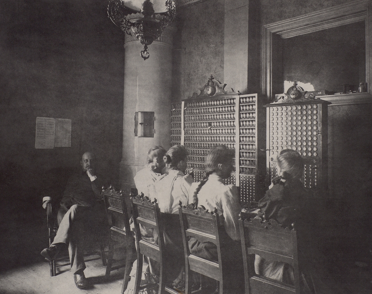 Nybrogatan 30. Bellbolagets station på Östermalm (1892). Sittande till vänster bolagets direktör C. Hallén.