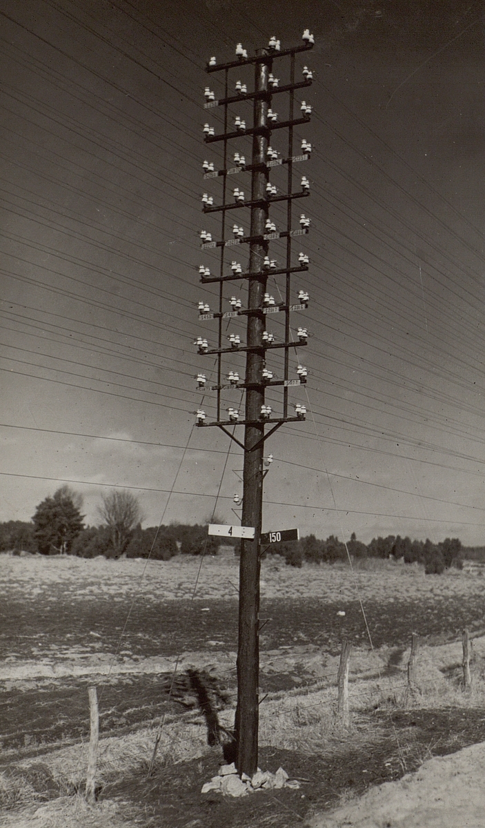 Olika detaljer i uppbyggnaden av ett blanktrådsnät 1930. Brytstolpe, totalbild.