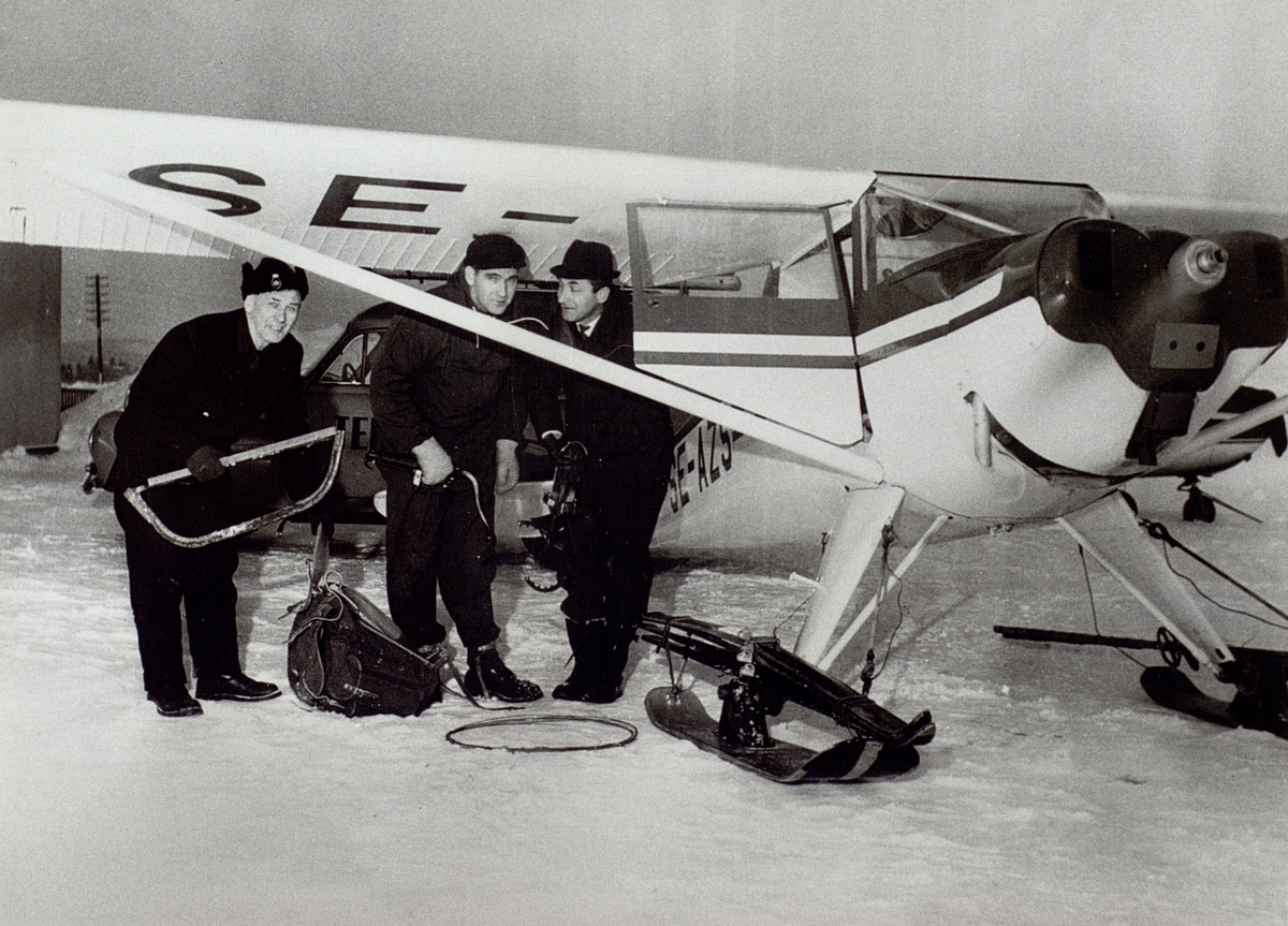 Motlanda flygfält 1966. Från vänster, Erik Barås, Arne Sandström och Arne Kring. Med detta flygplan åkte man ut och reparerade telefonlinjerna till Kråkön och Agön. Det var första gången som man i Hudiksvall fick ta flygplan till hjälp vid felavhjälpning.