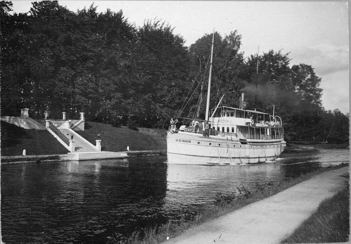 Göta Kanal. Ångbåten Venus vid Platens grav i Motala.