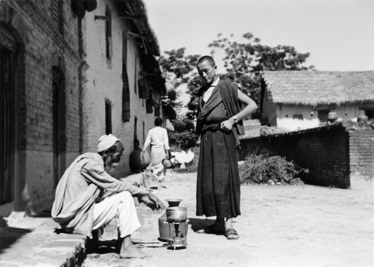 Äldre man och buddhistisk munk med fotogenkök från Optimus i Nepal 1962.