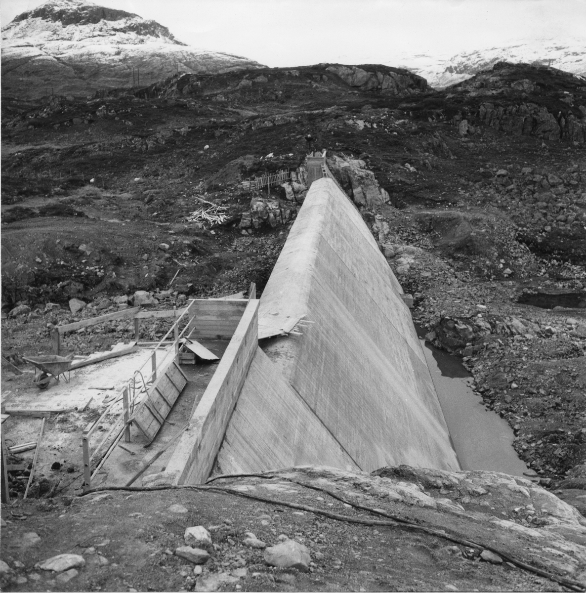 En av de många spärrdammarna som byggts uppe i högfjället och som ingår i det stora regleringsprojektet Tokkeanläggningen. Sammanlagt byggdes ett trettiotal dammar.