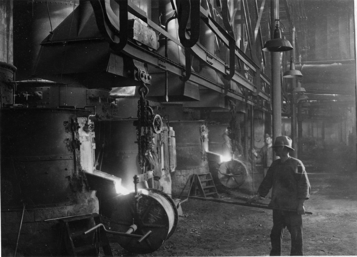 Husqvarna Vapenfabriks AB. Tappning av smält järn från kupolugnarna i gjutjskänkarna.