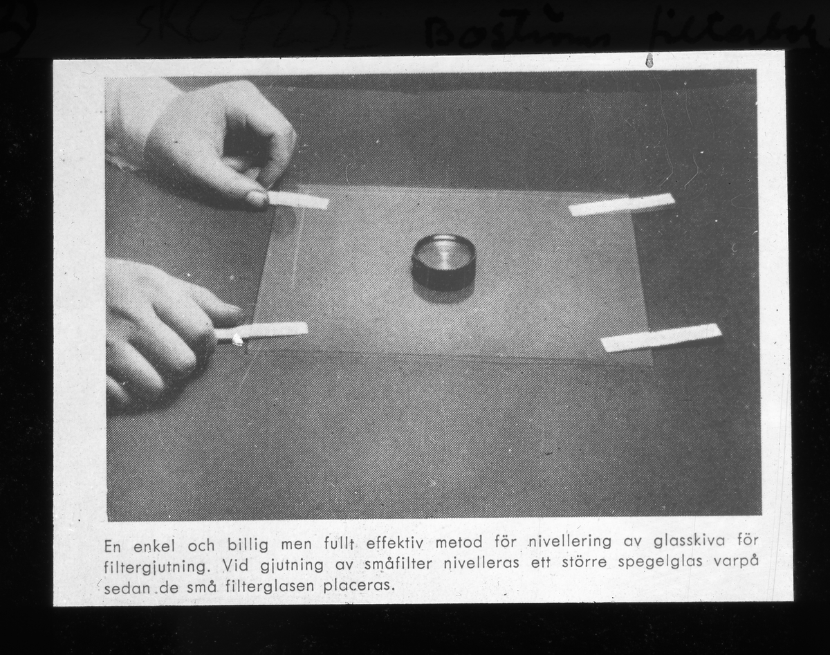 En enkel och billig men fullt effektiv metod för nivellering av glasskiva för filtergjutning. Vid gjutning av småfilter nivelleras ett större spegelglas varpå sedan de små filterglasen placeras.