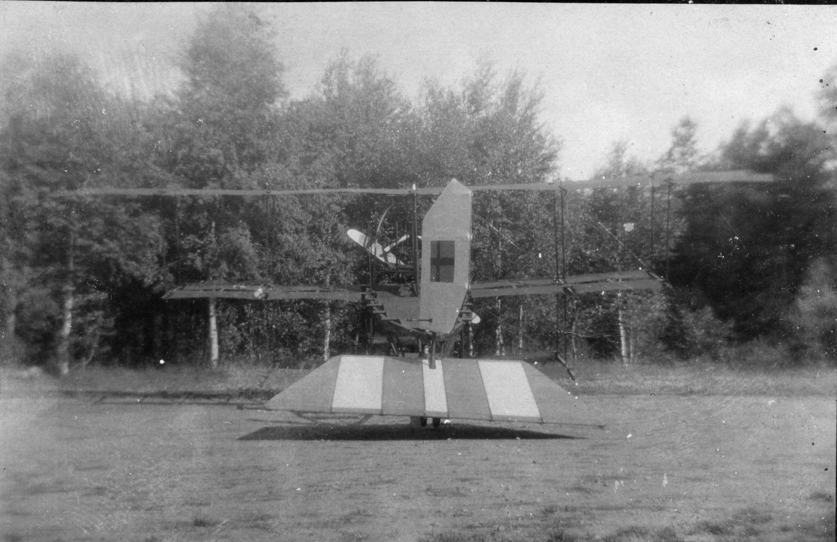 Detalj av hemmabyggd flygmaskin vid Meisters Flygaktiebolag 1927-1928. Provflygning i Torslanda 1928.