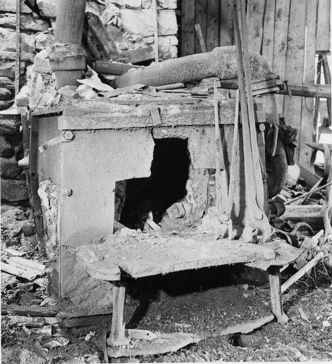 Skogafors bruk. Ugnen med några av de talrika tängerna. Rör till ugnen från blåsmaskinen.