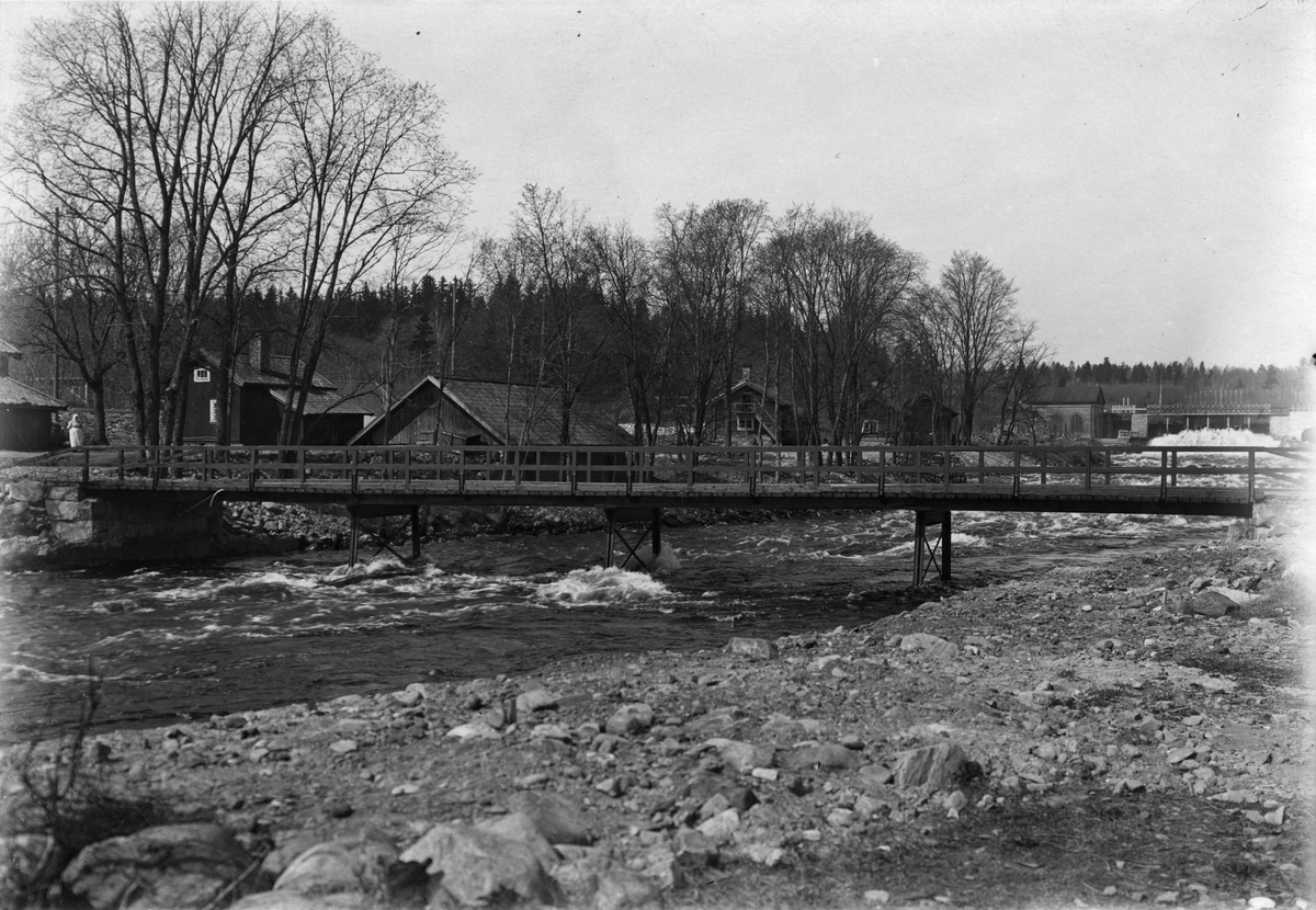 Semla bruk, Västmanland. Landsvägsbro vid nedre gamla kraftstaionen med äldre arbetarbostäder i bekgrunden, 1908.