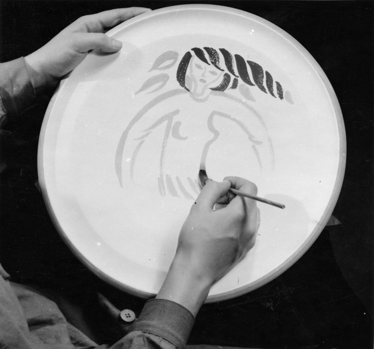 Gustavsbergs Porslinsfabrik. Fajansmålning Teknik surcru. Utföres med metalloxider direkt i den obrända glasyren. Formgivare Stig Lindberg.