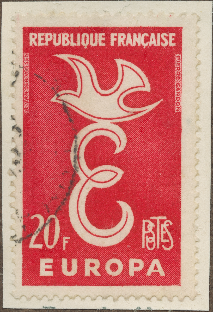 Frimärke från Frankrike, 1958. Motiv av E-symbol för "Europa" med fredsduva