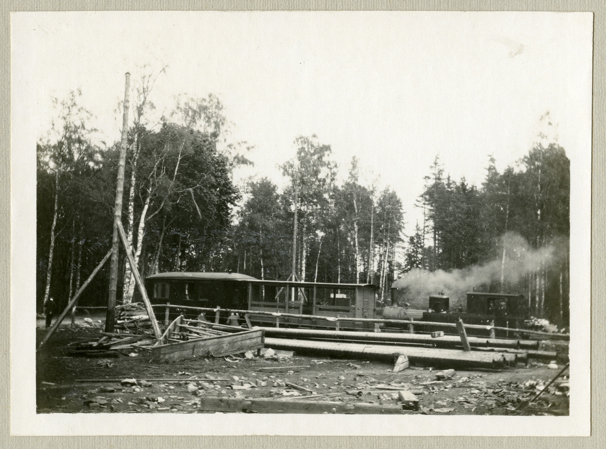 Första tåget på stickspåret Lienshyttan- Lerklockan, utanför Riddarhytte herrgård 1914.