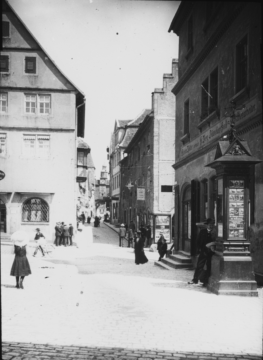 Skioptikonbild med motiv längs gatan Röder Strasse mot Markusturm i Rothenburg.