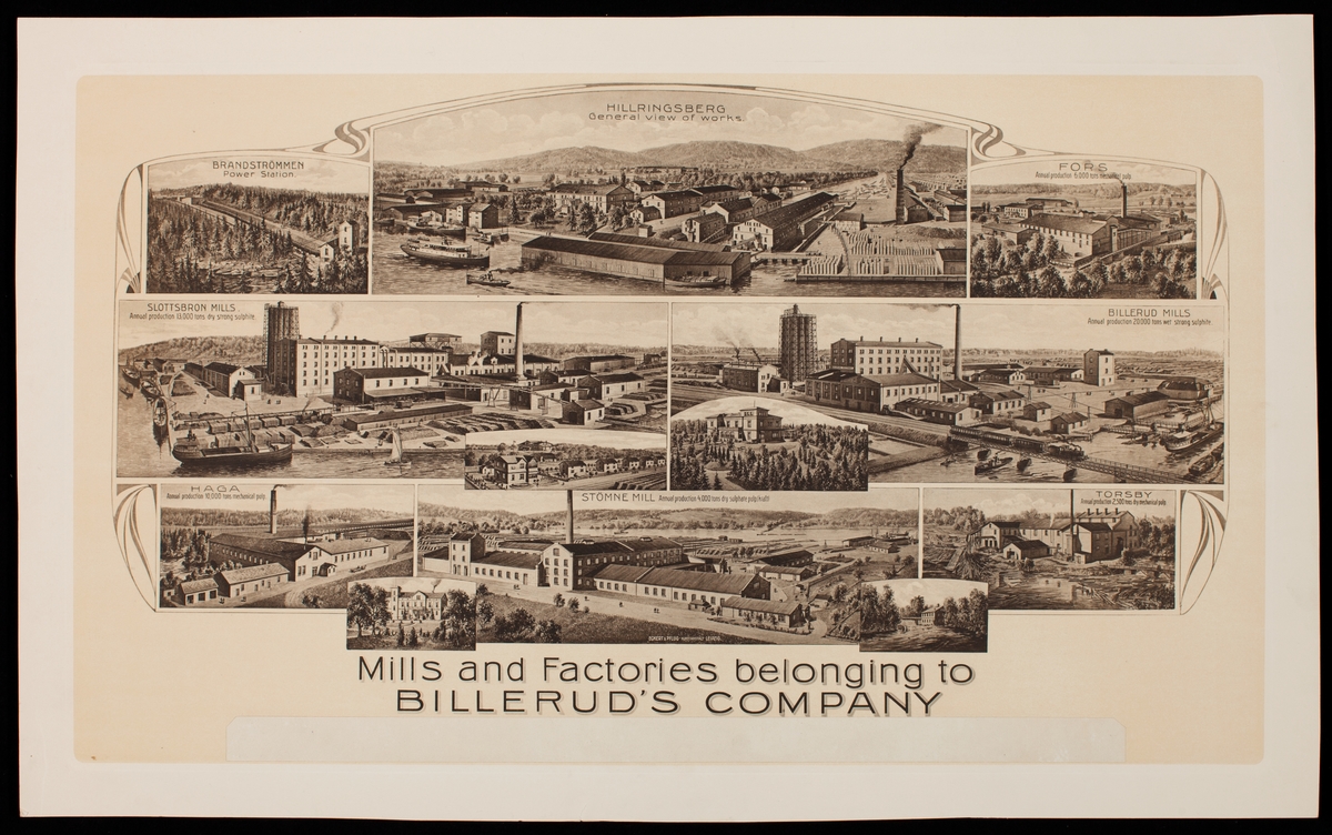 Reklambild över fabriken och anläggningar tillhörande Billeruds Aktiebolag i Säffle. Utförd omkring 1911-1912.