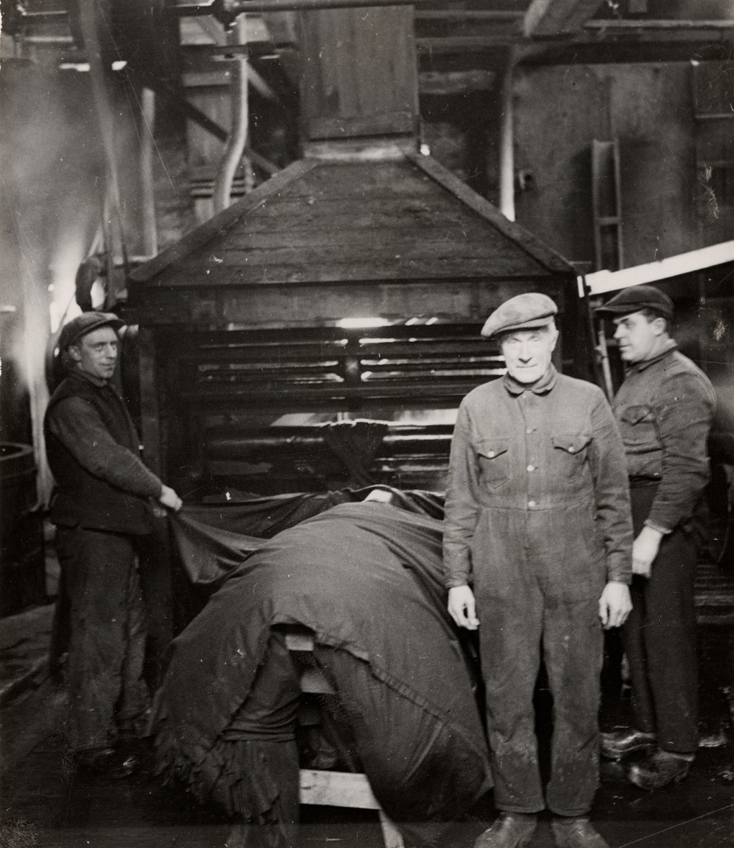 Abrahamsons Berednings Aktiebolag. Färdiga styck dragas ur färgkuffen. Ivan Pettersson, Lambert Pettersson och hans son Eskil Pettersson, förman. Kamgarnsstyck som färgats blå i färgeriet, 1934.