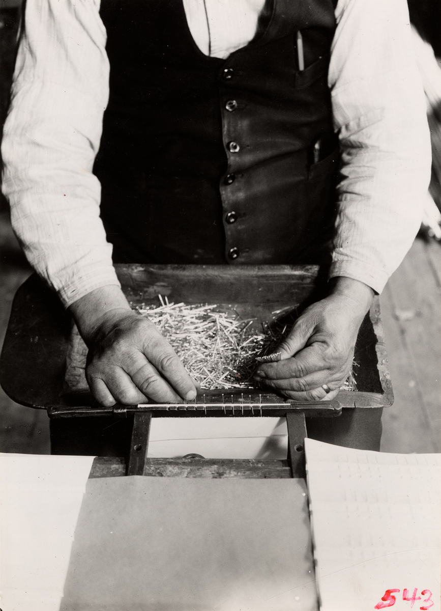 Knappnålstillverkning vid J.H. Tidbeck Metallduksväveri och Metalltrådsvarufabrik. Knappnålssax används för fastsättning av nålar i nålbrev.