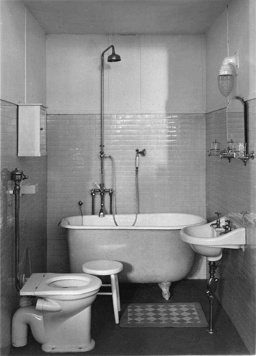 Bygge och Bo-utställningen i Gävle 1937. Litet badrum med "garderobsbadkar".