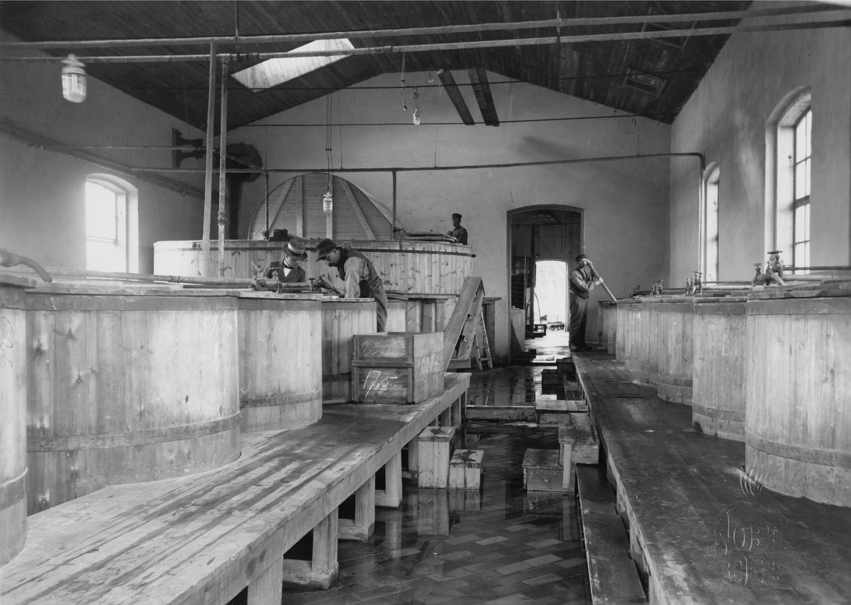 AB Bofors Nobelkrut. Stabilisering av bomullskrut (nitrocellulosa). I fonden kokhällare, i vilken den malda nitrocellulosan kokas, tills den blir fullkomligt stabil och sålunda kan utan risk upplagras. På båda sidor träkar, i vilka omald nitrocellulosa kokas. 1905.