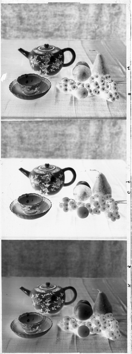 Titel: Skioptikonbild från institutionen för fotografi vid Kungliga Tekniska Högskolan. Stilleben. Bilden visar negativ för användning i Chromoskop för direkt betraktande av tre-färgsdiapositiv enligt additiv metod. Använd av professor Helmer Bäckström (och dessförinnan) av docent John Hertzberg som undervisningsmaterial. Bäckström var Sveriges förste professor i fotografi vid Kungliga Tekniska Högskolan 1948-1958. För mer info: se Fotografisk Handbok av Helmer Bäckström. Natur och Kultur. Andra omarbetade upplagan 1958-59. Kap 129 Färgfotografiska metoder - en översikt (sid 965 och följande). (För användning i kromoskop liknande föremålet TM45560).