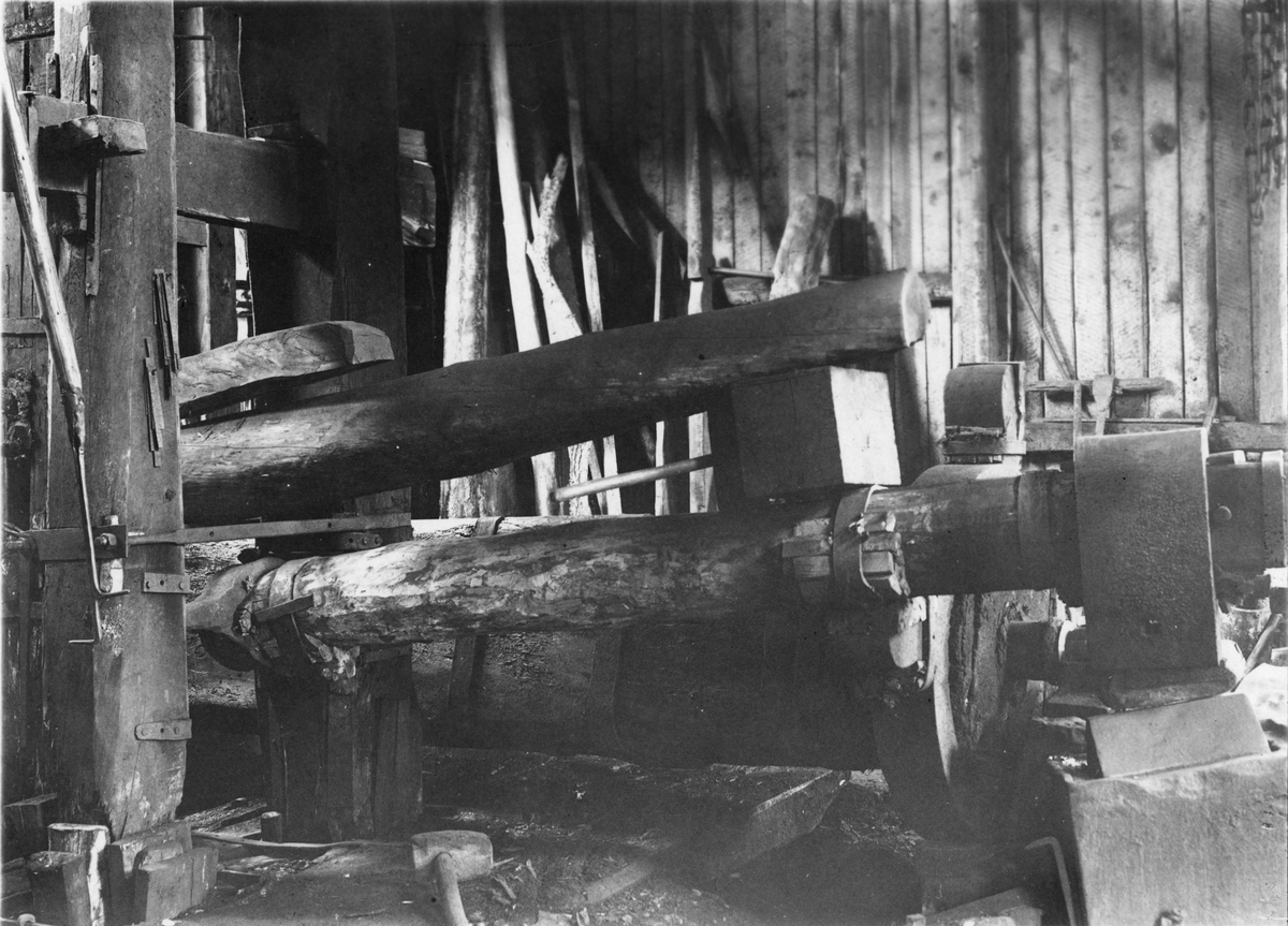 Skogafors bruk. Interiör från smedjan. Stångjärnshammare. Ovanpå skaftet en fyrkantig träkloss som är tillfälligt ditlagd. Så "tryckare" och den kortare "övertryckaren". I hammarskaftets bortre del "hylstern", mellan de lodrätt stående "stångarna".