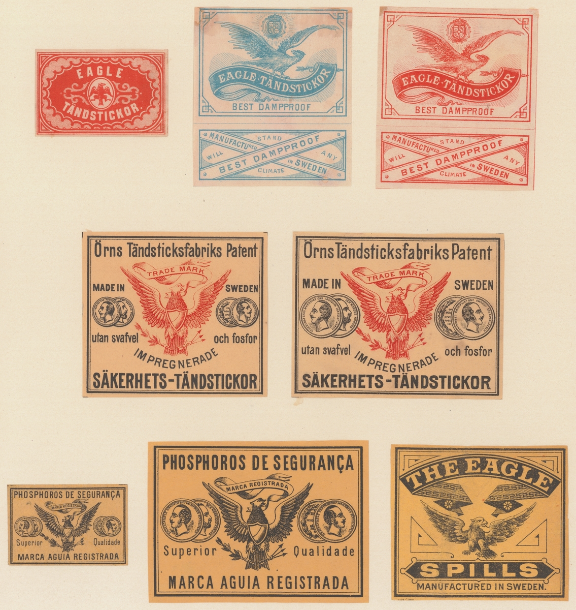 Etiketter för tändsticksaskar, från Svenskt Industri- och Handelsmuseum.