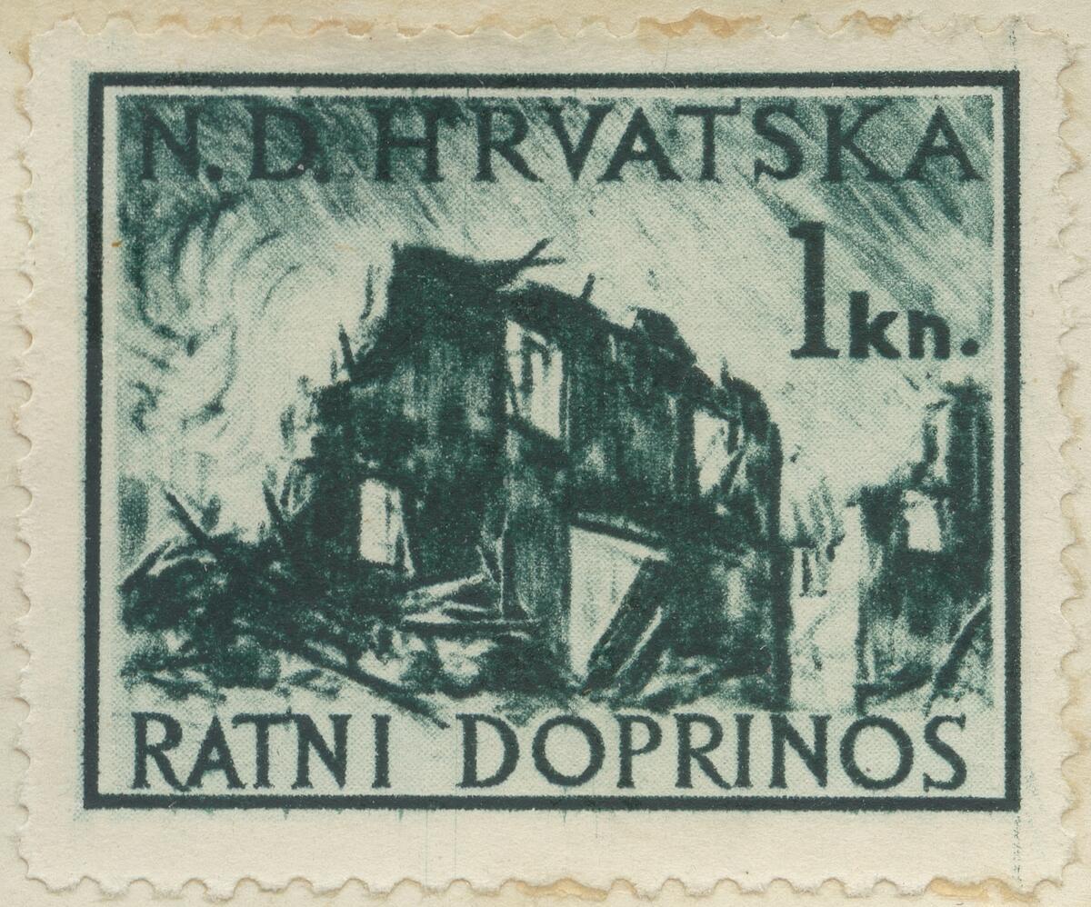 Frimärke från Kroatien, 1943-44. Motiv av Krigshärjat hus i Kroatien -Till förmån för krigsoffren-