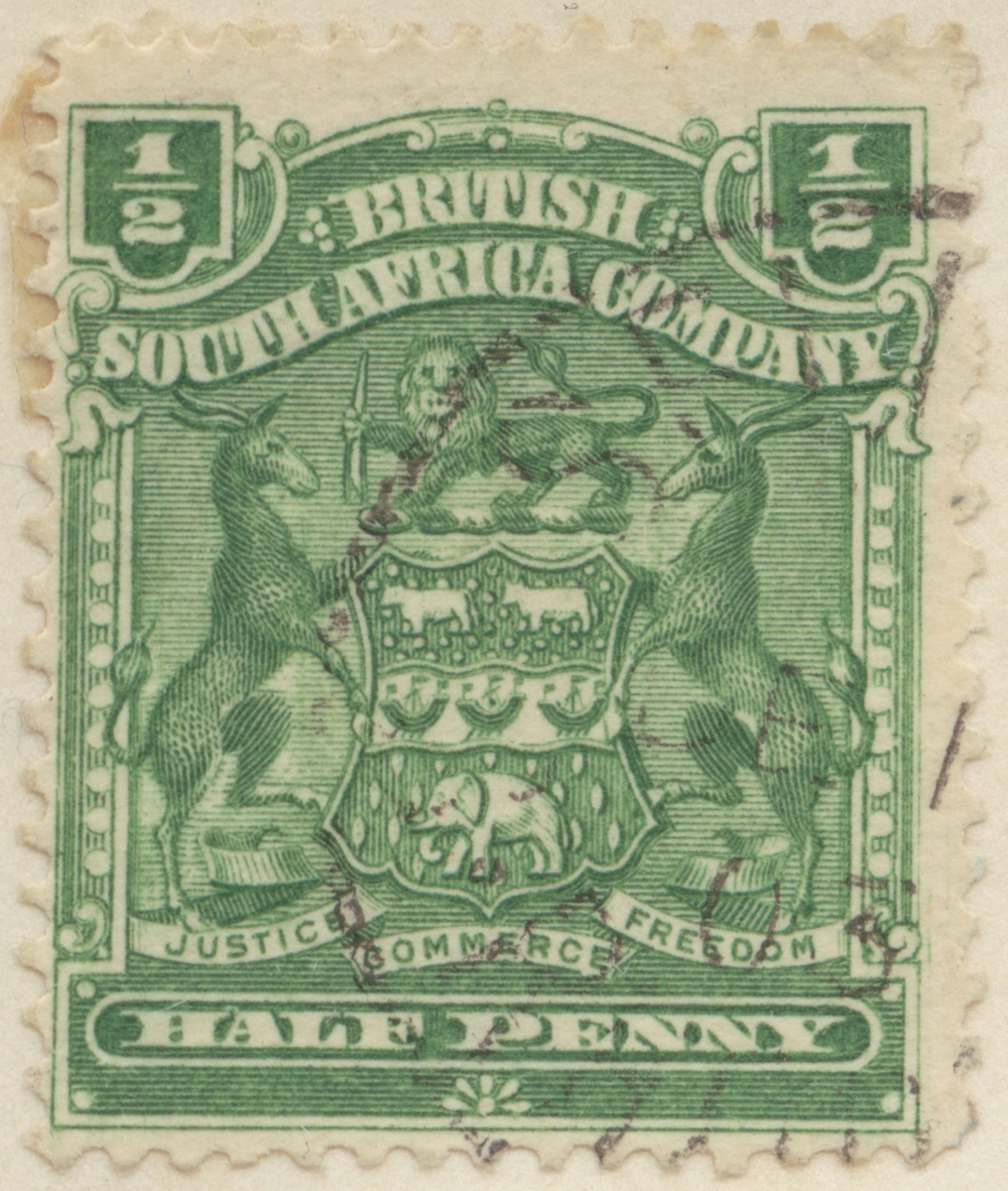 Frimärke från Brittiska Syd Afrika Kompaniet, 1898. Motiv av Gazell -Lejon. Elefant-