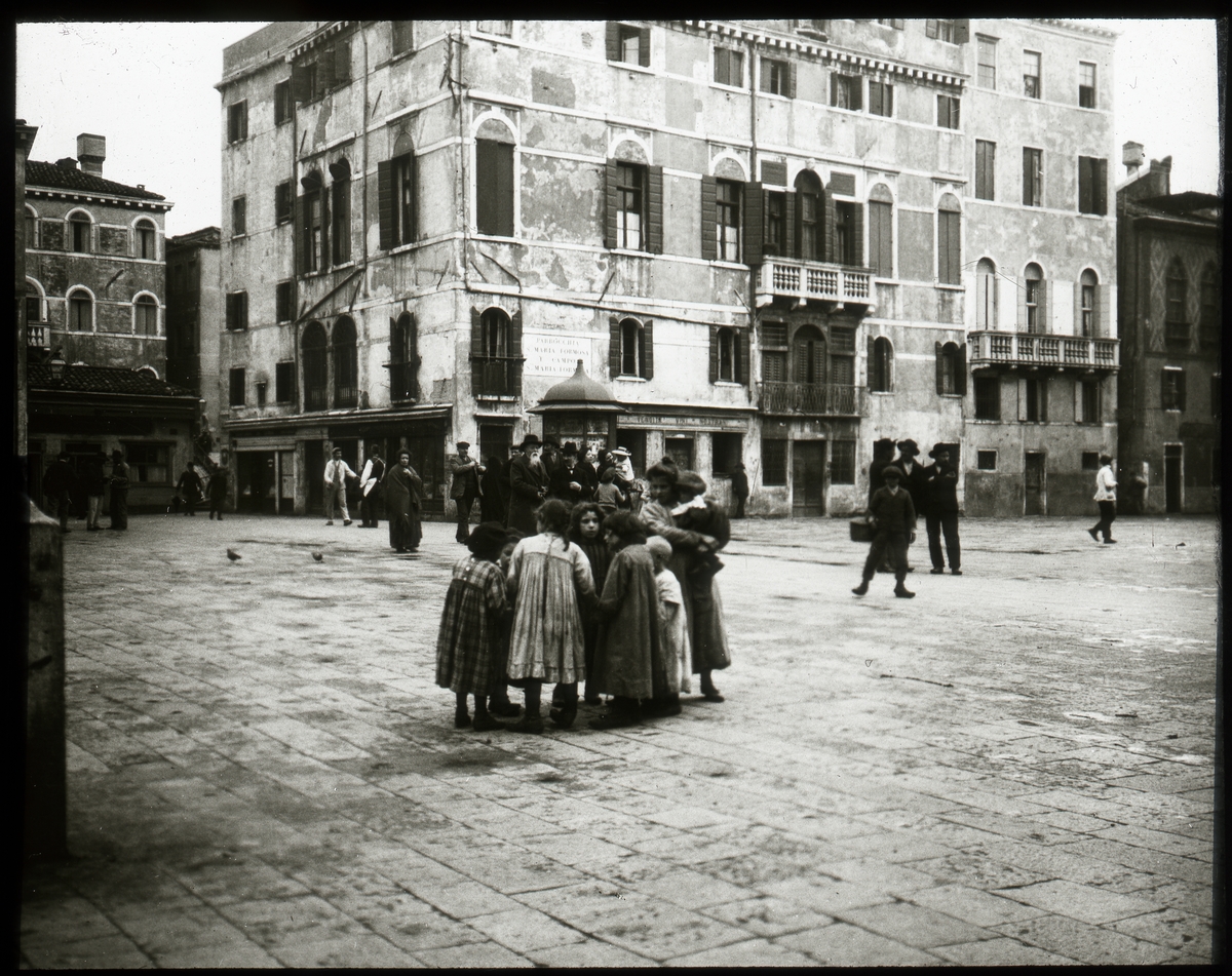 Skioptikonbild från institutionen för fotografi vid Kungliga Tekniska Högskolan. Motiv från ett torg i Venedig. Bilden är troligen tagen av John Hertzberg under en resa i Europa.