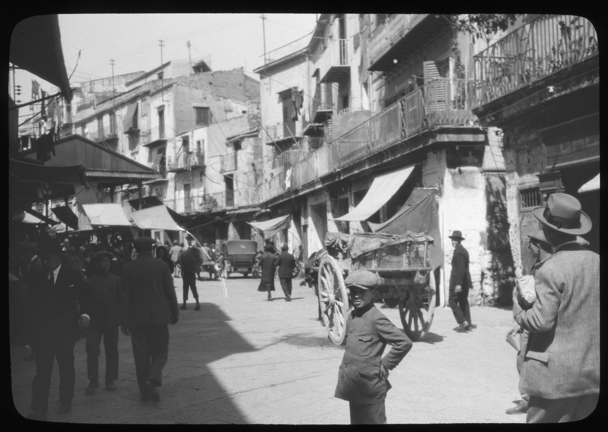 Skioptikonbild från institutionen för fotografi vid Kungliga Tekniska Högskolan. Bilden är troligen tagen av John Hertzberg under en resa i Europa. Hertzberg blev docent i fotografi 1921vid Kungliga Tekniska Högskolan i Stockholm. Gatuliv.