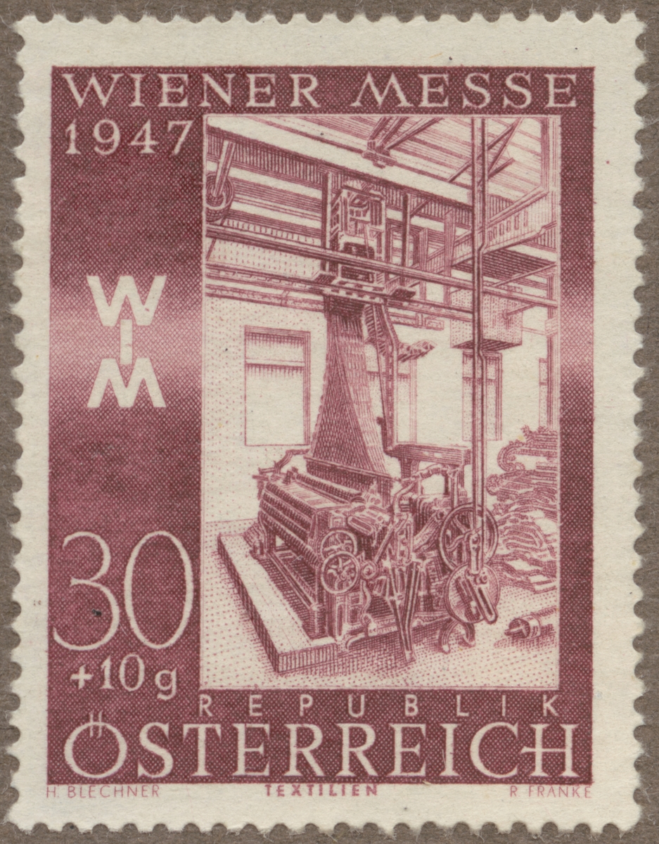 Frimärke från Österrike, 1947. Motiv av jacquardvävstol i Österrike 1947. "Joseph Marie Jacquard (1752-1834) konstruerade 1805 den första mönstervävnadsapparatur. Han belönades med en livränta av staden Lyon." "Wienermässan 1947"