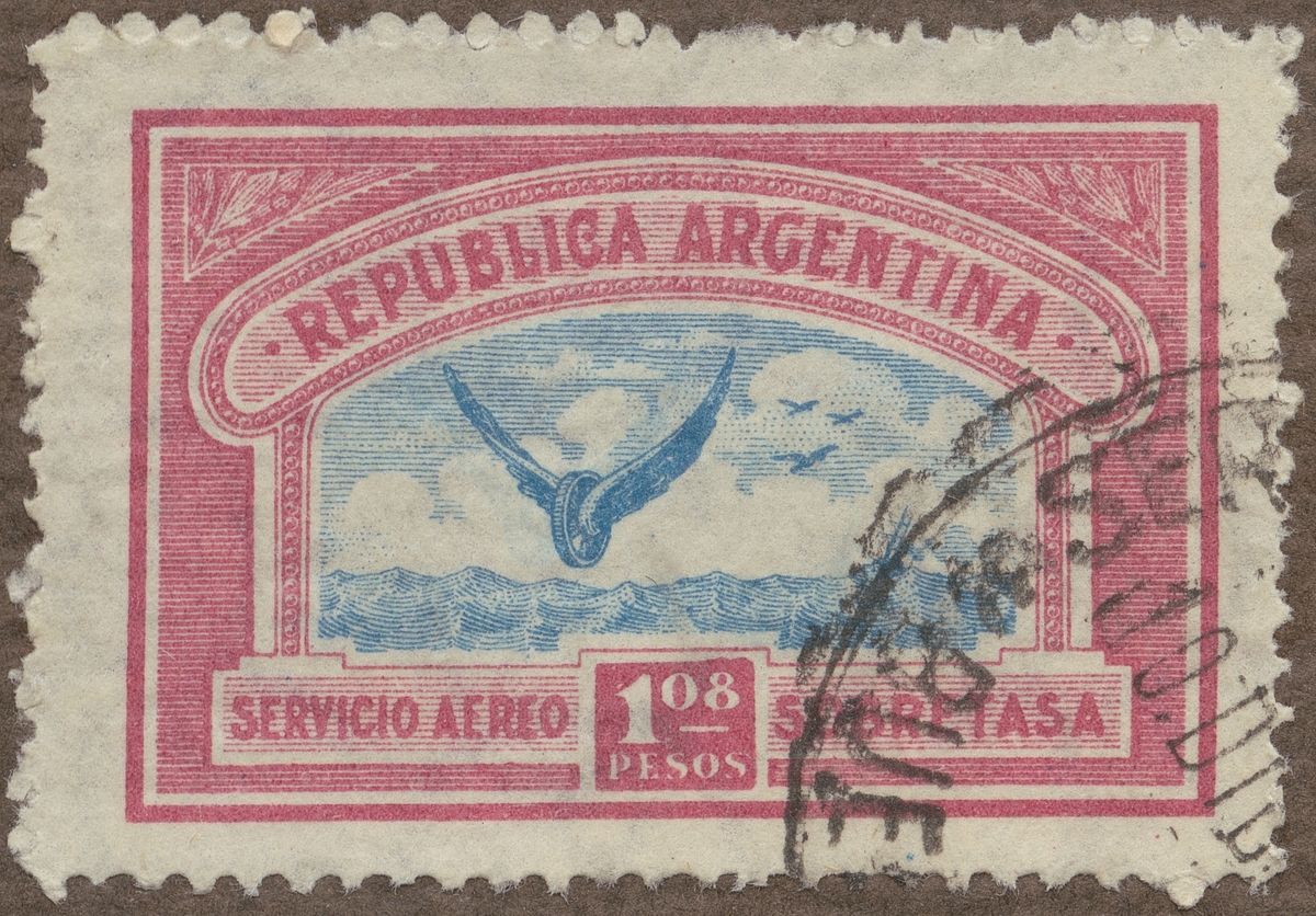 Frimärke från Argentina, 1928. Motiv av Vingat hjul i luften, symbol för flygpost