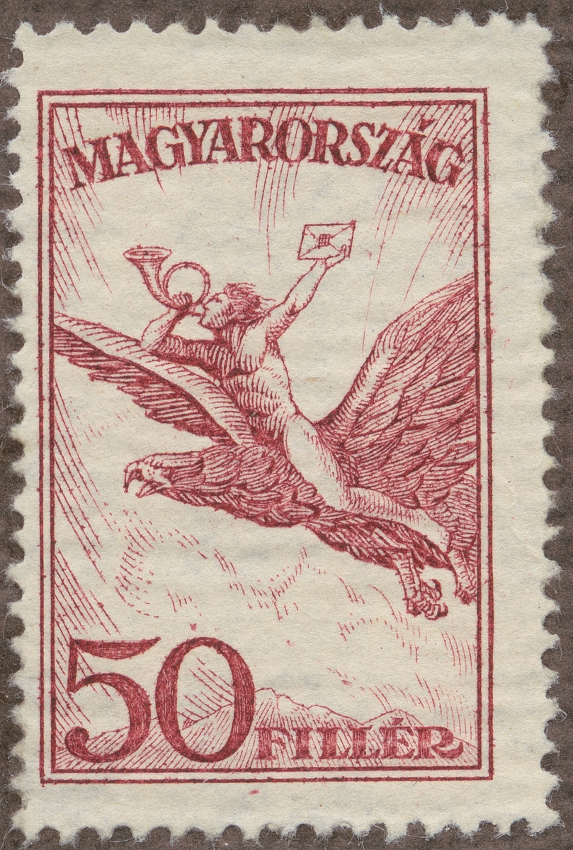 Frimärke från Ungern, 1927. Motiv av Postbud med posthorn på örn - Symbol för flygpost-