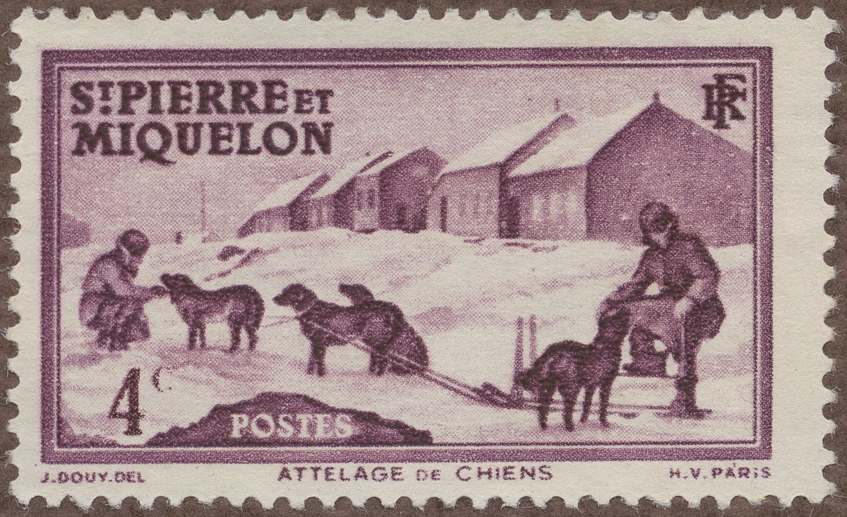 Frimärke ur Gösta Bodmans filatelistiska motivsamling, påbörjad 1950. Frimärke från S:t Pierre et Miquelon, 1932. Motiv av Litet hundspann framför släde på S:t Pierre och Miquelon-öarna ":- fransk koloni vid sydkusten av New Foundland-"