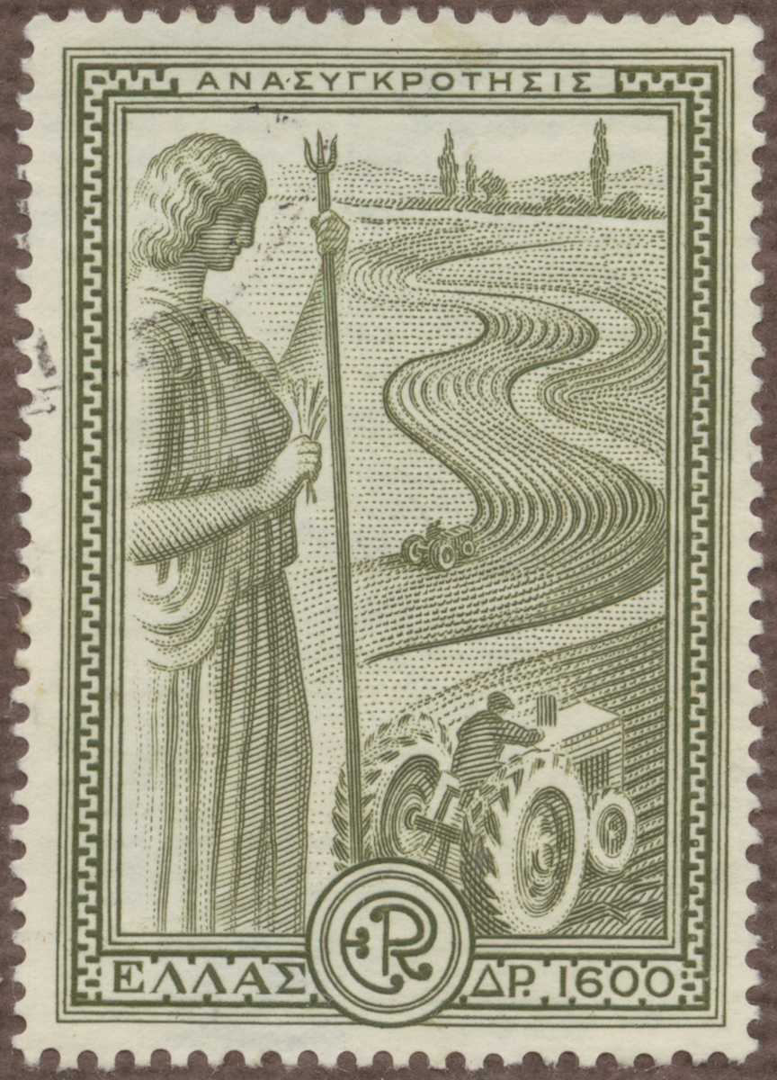 Frimärke från Grekland, 1951. Motiv av Maskinplöjning vid jordbruk